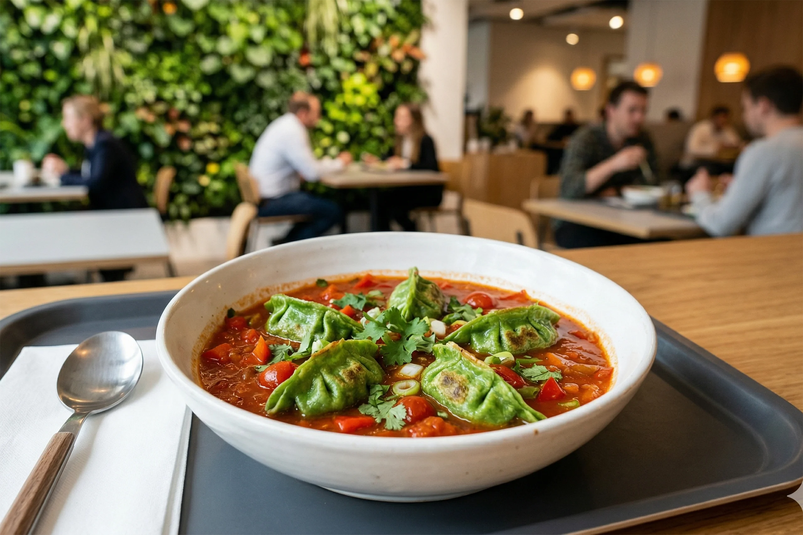 Grüne Gyoza in würziger Tomaten-Paprika-Brühe